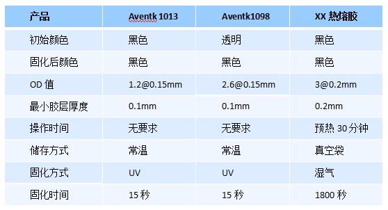 針對以上問(wèn)題,AVENTK還研發(fā)了一款變色UV黑膠,能夠良好解決以上不足。變色UV黑膠在膠水固化后變色之前,就是普通的UV膠,具備UV膠固化速度快的優(yōu)勢,不存在光線(xiàn)遮擋導致的固化不完全的問(wèn)題,較熱熔膠方案固化速度快非常多;膠水固化后變成黑色,解決了傳統UV膠遮光導致固化不足的問(wèn)題,遮光效果也可以同熱熔膠媲美。各項對比如下: