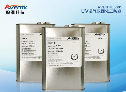 UV三防漆采用UV+濕氣雙重固化方式,100%固含量,無(wú)溶劑揮發(fā)。在通過(guò)UV光照射固化后,對于UV光不好照射的陰影區域還能進(jìn)行二次濕氣固化。另外還可添加藍色的熒光劑,方便直接檢測。