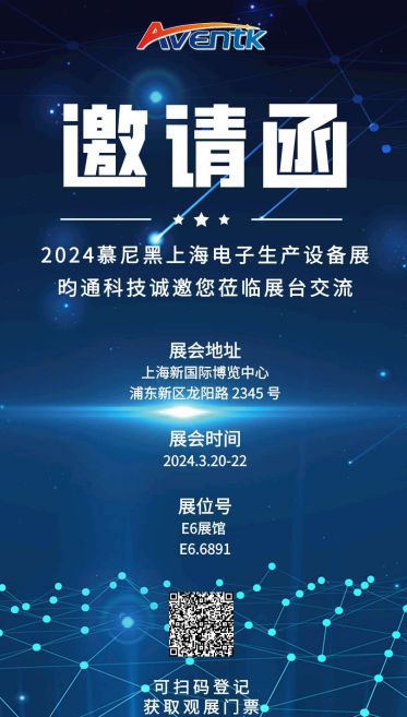 昀通科技(AVENTK)將于3月20-22日,在上海新國際博覽中心參加2024慕尼黑上海電子生產(chǎn)設備展(展位號:E6.6891),誠邀您蒞臨展臺參觀(guān)交流。